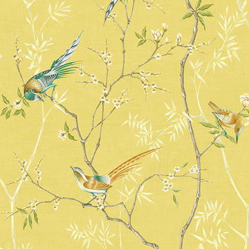 This delightful wallpaper design shows birds swooping, perching and pecking amidst branches of foliage and...