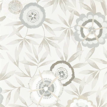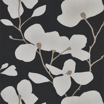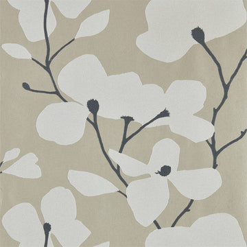 A painterly magnolia trails across this wide width wallpaper in two soft colourways. Delicate metallic...