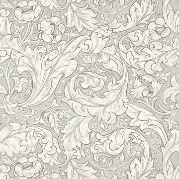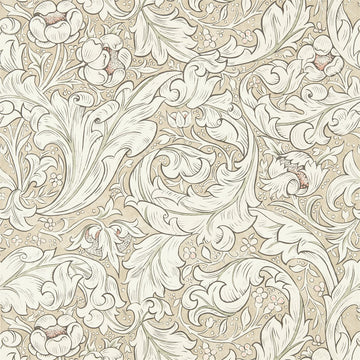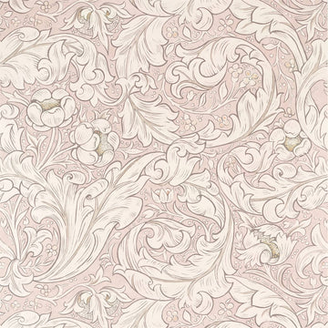 Scrolling acanthus leaves and flowers adorn this wallpaper, adapted from an embroidery designed in the...