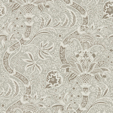 Scrolling acanthus leaves and flowers adorn this wallpaper, adapted from an embroidery designed in the...