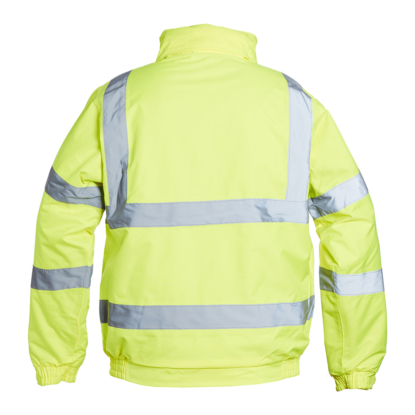 The Blackrock Hi-Vis Bomber Jacket is a durable, high-visibility work jacket designed for comfort, warmth and protection in challenging conditions. It features a quilted lining for insulation, a concealed foldaway hood and elasticated storm cuffs to keep out wind and rain. The heavy-duty two-way zip is complemented by a full-length storm flap for additional weather protection.
