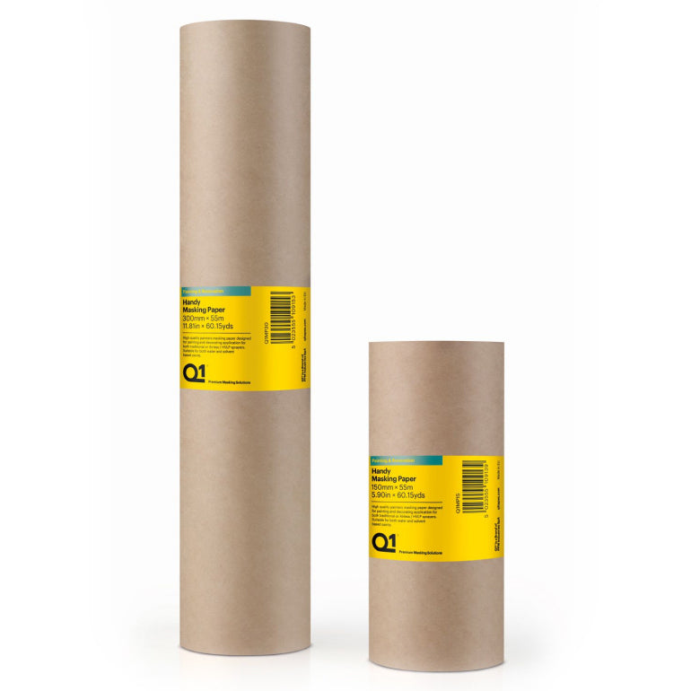 Q1 Handy Masking Paper is a high-quality masking paper roll designed to make surface protection during painting and decorating quick and reliable. It is suitable for use with both brush and spray painting methods and compatible with water-based and solvent-based paints, helping to prevent overspray and paint seepage on large areas such as door and window frames or beams. The paper works well with standard hand masking dispensers thanks to its 25mm core size and offers good coverage for general-purpose masking tasks in professional or DIY settings.