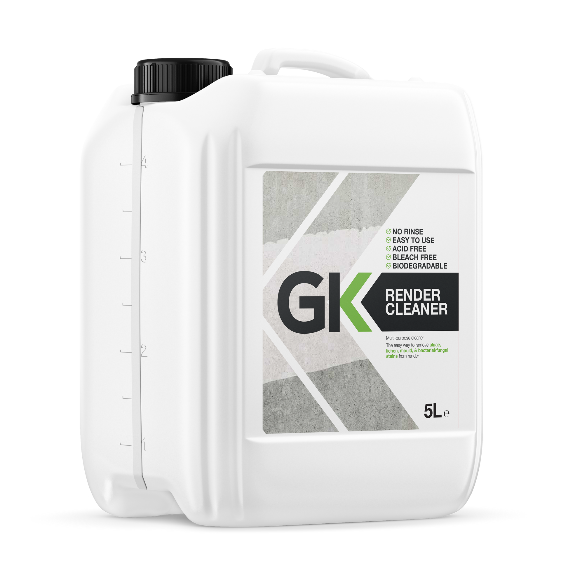 GK Render Cleaner is a high-performance, long-lasting multi-purpose cleaner specifically developed for the effective removal of organic and microbiological soiling, including algae, lichen, mould, and bacteria, from external hard surfaces. It is particularly well-suited for use on render, helping to restore a clean and well-maintained appearance.