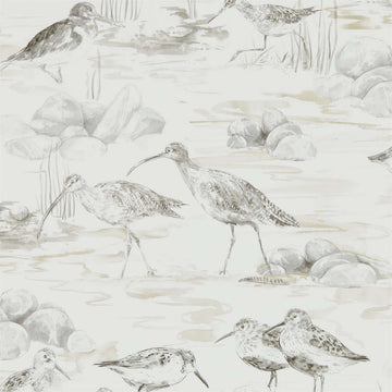 A captivating wallpaper design featuring faithful interpretations of wading birds basking in the gentle sun,...