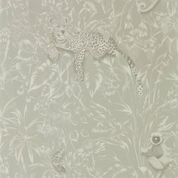 A contemporary toile wallpaper featuring elephants and their offspring camouflaged against a backdrop of exotic...
