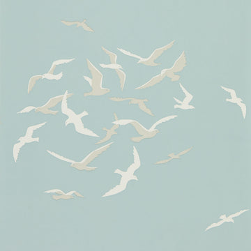A tranquil wallpaper design featuring graceful silhouetted seabirds soaring through the summer sky. This design...