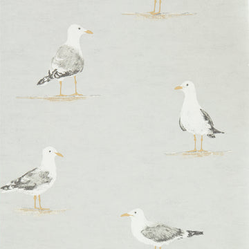 Friendly seagulls perch on the sand in this charming hand painted wallpaper. Originally created with...