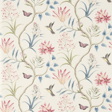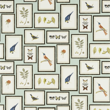 Botanically drawn organic forms of corals, shells, birds, and feathers are presented as framed souvenirs...