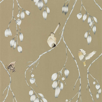 This delicate foliage trail wallpaper includes carefully etched butterflies and birds perching on willow-like branches...