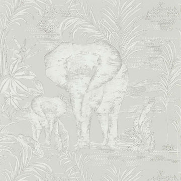 A contemporary toile wallpaper featuring elephants and their offspring camouflaged against a backdrop of exotic...