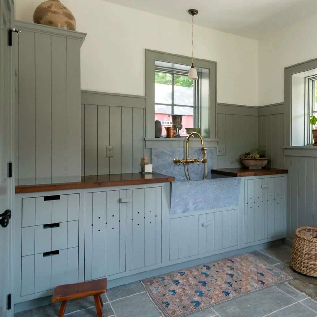 This shade works particularly well in more intimate or traditional spaces. Farrow & Ball suggest it for cloakrooms, studies, boot rooms, or in panelled rooms where its depth can be appreciated. It’s also surprisingly popular on kitchen islands when paired with a more delicate shade like Dimpse, creating a balanced contrast.