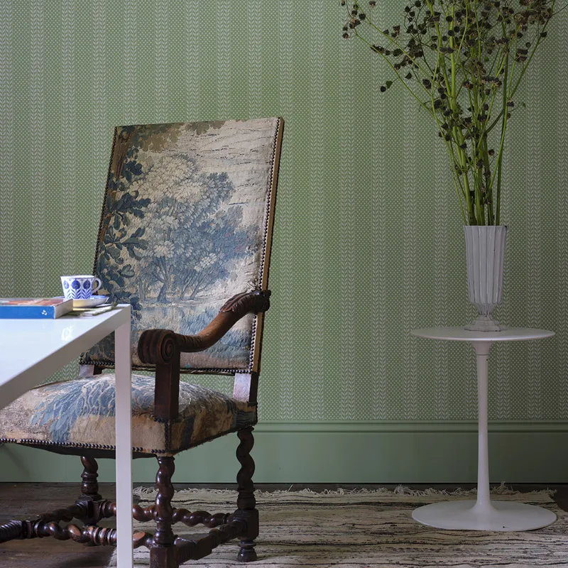 Polka Sprig is inspired by enchanting background details found on two 18th-century wallpapers. Handcrafted in Dorset, the background colour is brushed on for subtle texture and then the embellishment is applied with a block.