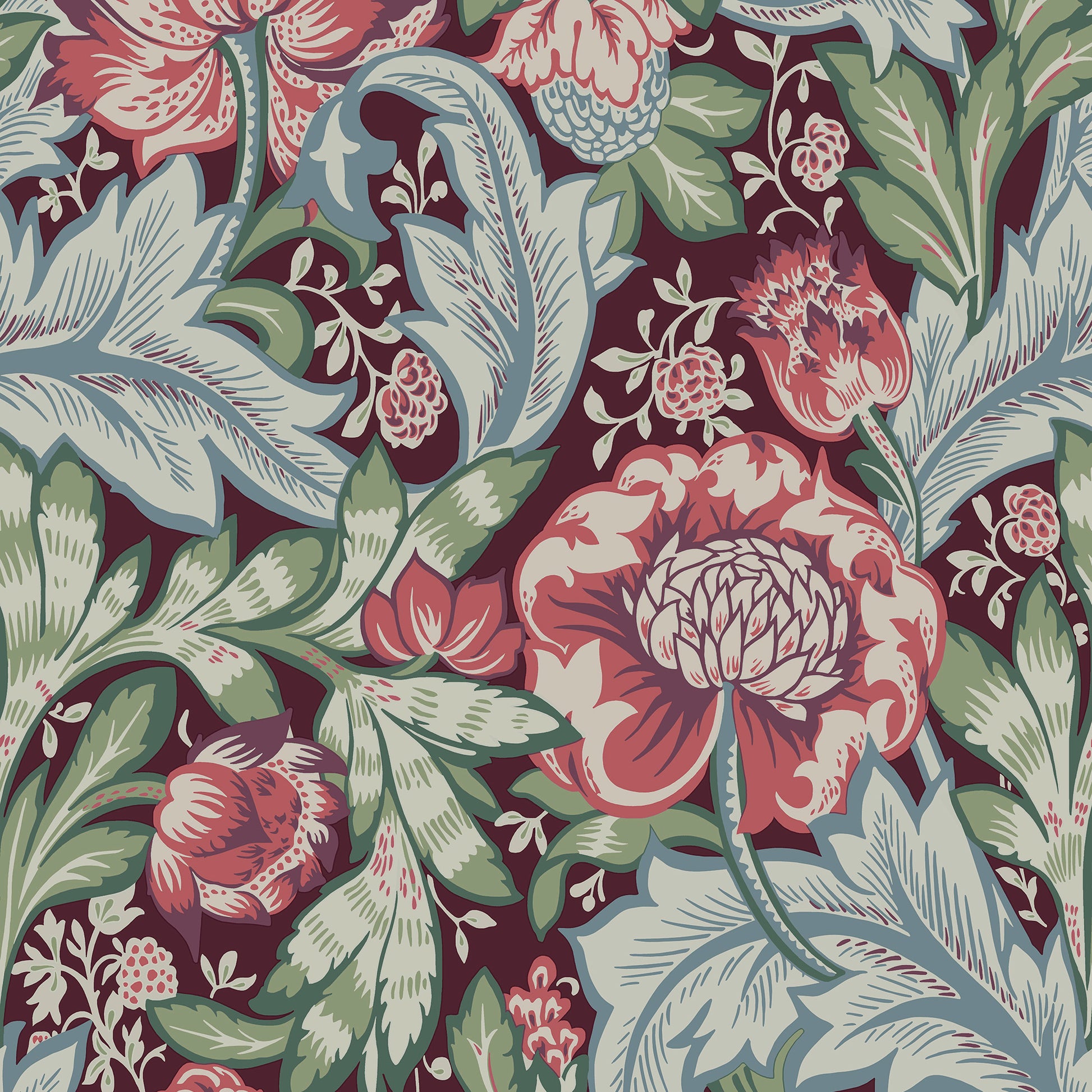 The Acanthus Garden wallpaper from the Arts and Crafts collection by Galerie is a striking representation of vintage elegance, capturing the essence of the Arts & Crafts movement. This iconic print, inspired by the original Acanthus designs by William Morris in the 1800s, features dramatic, swaying acanthus leaves surrounded by blooming florals.