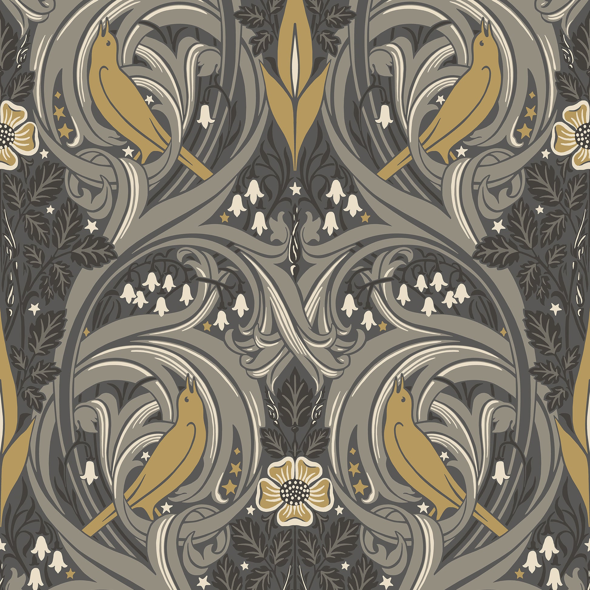 The Bird Scroll wallpaper from the Arts and Crafts collection by Galerie beautifully blends the elegance of Arts and Crafts with the distinctive motifs of Art Nouveau. This iconic wallpaper is a testament to vintage-inspired prints, featuring delicate birds gracefully perched amidst a scrolling Art Nouveau-inspired damask.