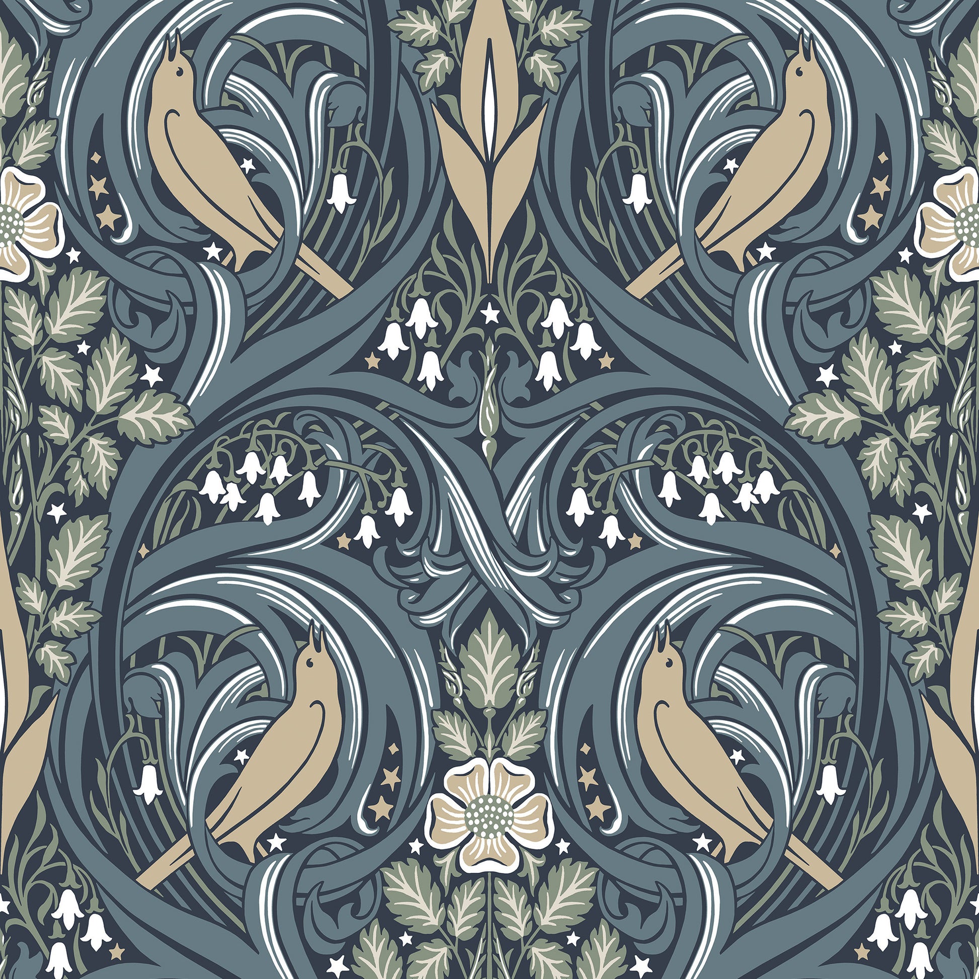 The Bird Scroll wallpaper from the Arts and Crafts collection by Galerie beautifully blends the elegance of Arts and Crafts with the distinctive motifs of Art Nouveau. This iconic wallpaper is a testament to vintage-inspired prints, featuring delicate birds gracefully perched amidst a scrolling Art Nouveau-inspired damask.