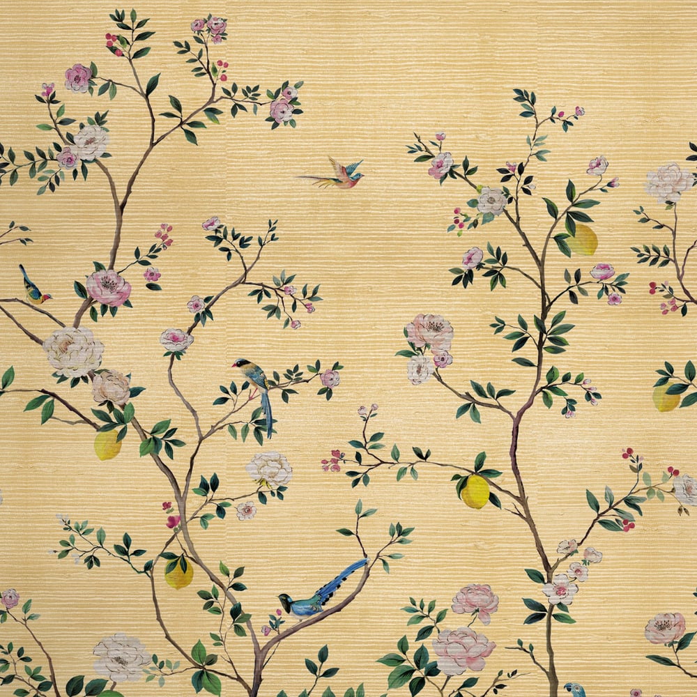 “Blossom” is a chinoiserie-style mural that combines lush, painterly floral motifs with whimsical touches of nature. Peonies, small tea-roses, berries and leafy blossoms interweave across the surface, punctuated by delicate birds, butterflies, and hints of citrus fruit like lemons among branches. The design strikes a balance between ornate detail and airy elegance, making it well suited for feature walls in bedrooms, dining rooms or living spaces that need a decorative focal point.