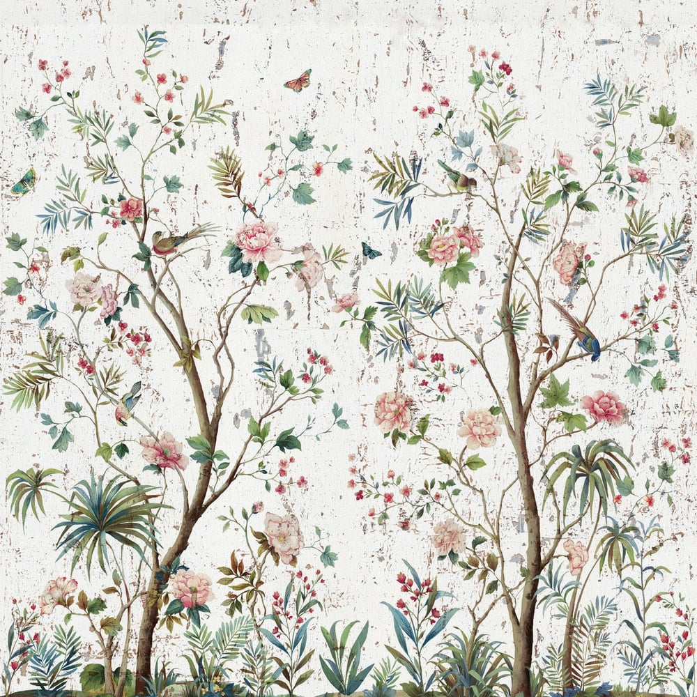 Charleston Garden is a captivating chinoiserie mural that brings the timeless elegance of Southern gardens into your home. Designed by Jaima Brown Emmert, this mural features a harmonious blend of lush foliage, delicate florals, and graceful wildlife. Peonies, plumeria, primrose, crocus, yucca, dracaena, fern, and gardenia bloom from a garden base dotted with large stones, where birds and butterflies flutter among the flowers.