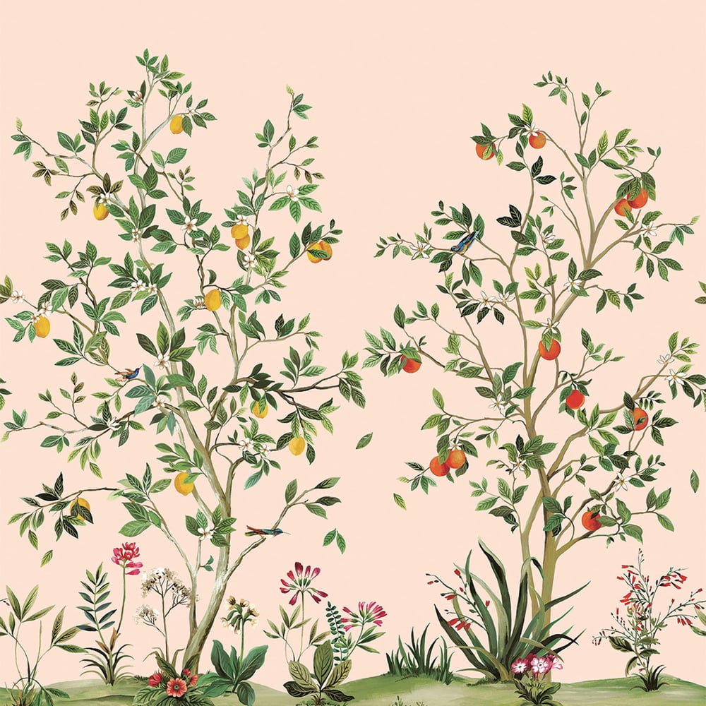 Galerie Wallpaper “Citrus Grove” by Daisy Bennett is a vibrant mural that brings the sun-kissed charm of a Mediterranean orchard into your home. Inspired by the designer's own lemon tree and the picturesque Amalfi Coast, this mural features hand-painted lemon and orange trees adorned with delicate blossoms and ripe fruits. Hummingbirds flit among the branches, adding a lively touch to the serene scene.