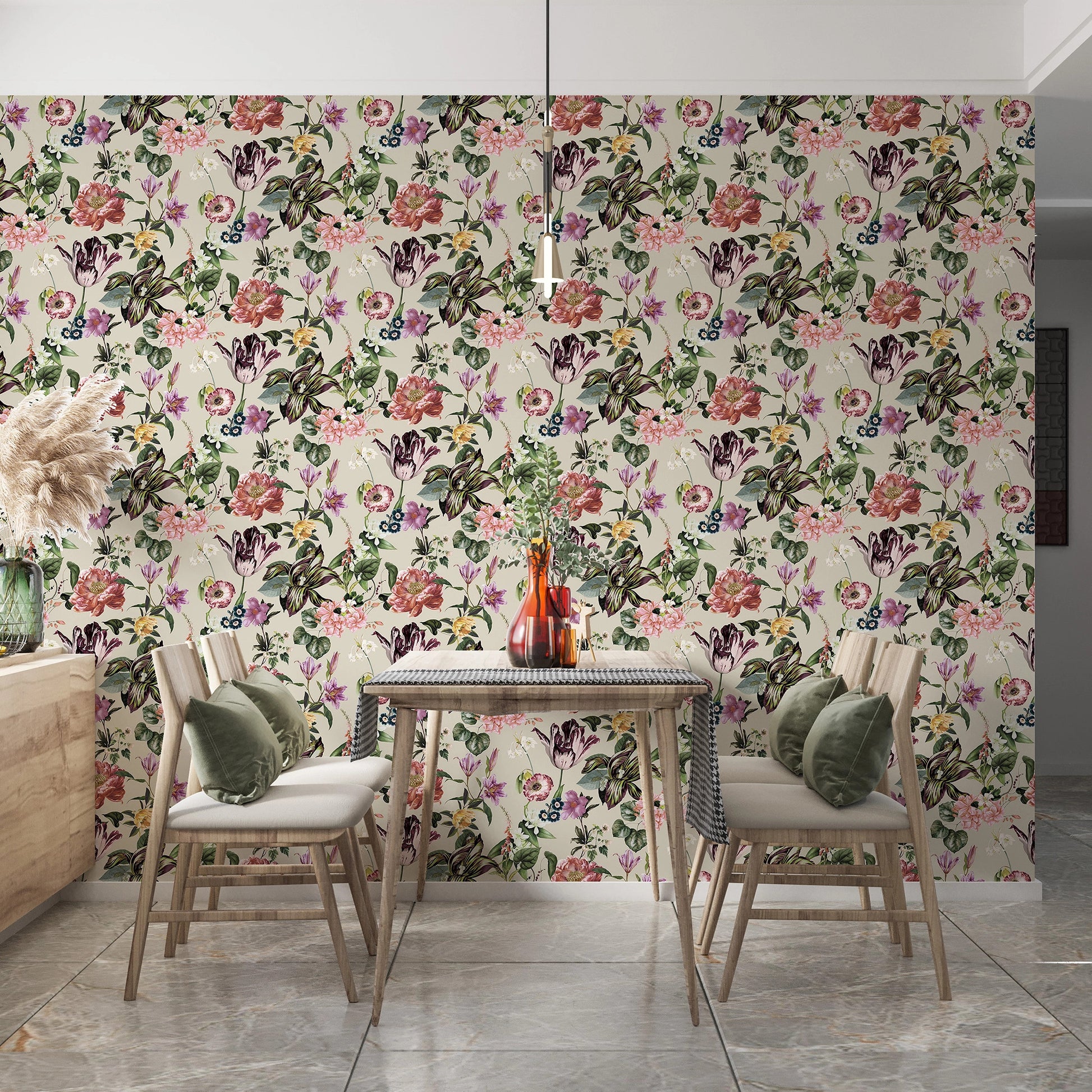 The exuberant and vibrant display of flowers brings a sense of joy and energy to the space, making it a visually striking and emotionally uplifting choice for interior decor. This wallpaper serves as a statement piece, transforming the atmosphere with its dynamic and dramatic floral arrangement. Whether used as a feature wall or applied to all four walls, it promises to create a space filled with beauty and positivity.