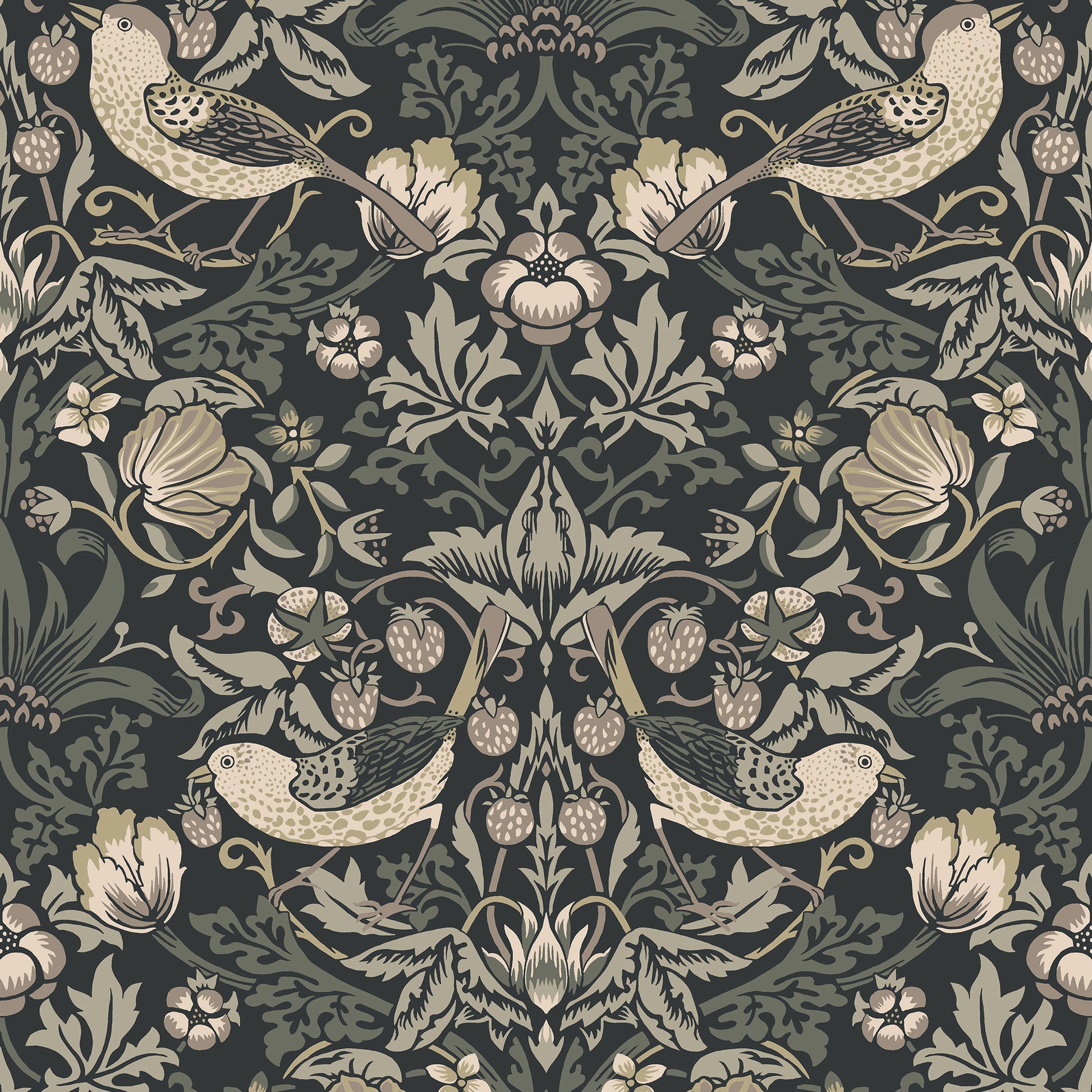 The Fragaria Garden wallpaper from the Arts and Crafts collection by Galerie pays homage to the iconic Strawberry Thief design by William Morris. This interpretation captures the essence of Morris's playful depiction, showcasing cheeky birds engaged in pecking at strawberries amongst vines and shrubbery. The Strawberry Thief design, originally conceived by William Morris, holds historical significance as it reflects the common struggle gardeners face with birds feasting on their fruits.