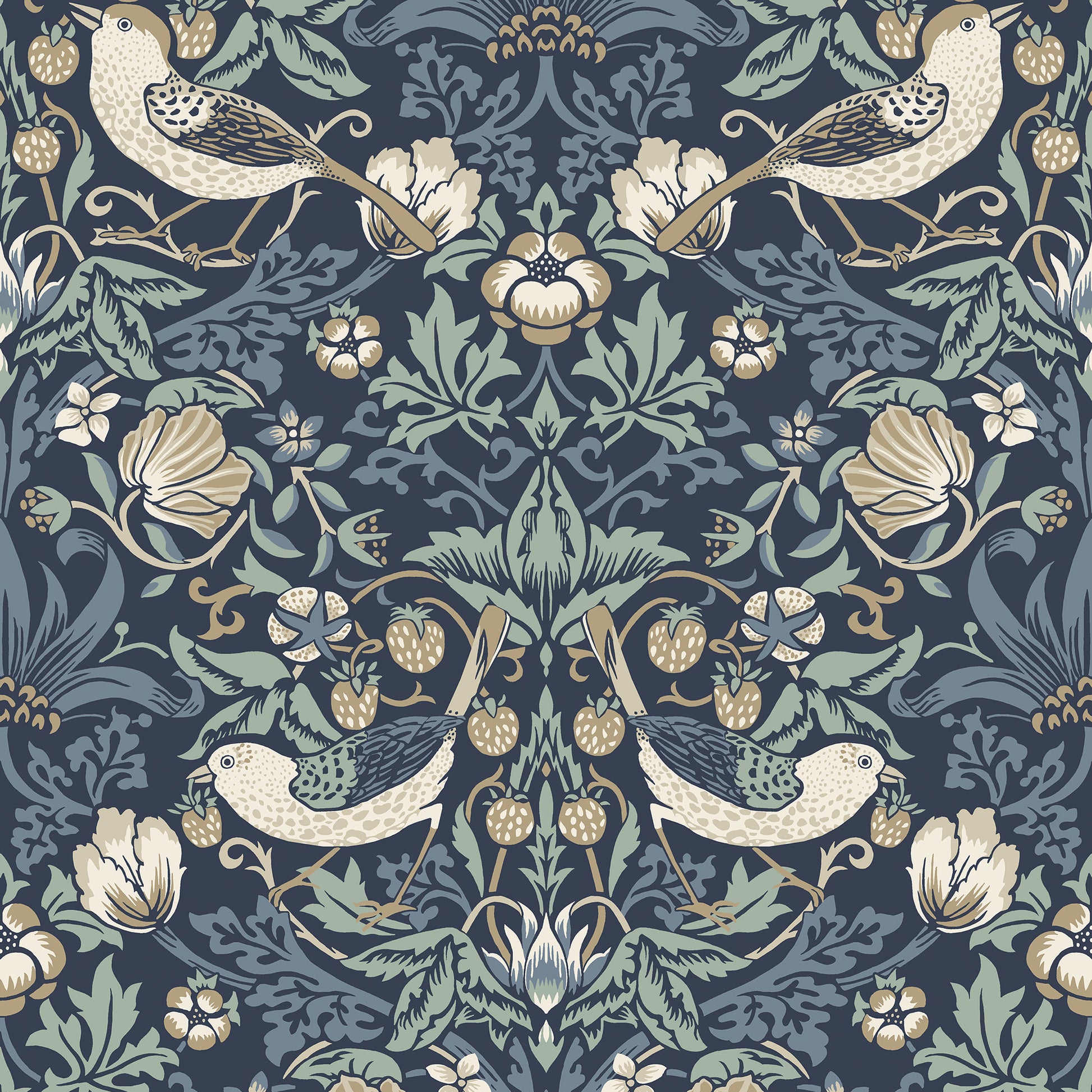 The Fragaria Garden wallpaper from the Arts and Crafts collection by Galerie pays homage to the iconic Strawberry Thief design by William Morris. This interpretation captures the essence of Morris's playful depiction, showcasing cheeky birds engaged in pecking at strawberries amongst vines and shrubbery. The Strawberry Thief design, originally conceived by William Morris, holds historical significance as it reflects the common struggle gardeners face with birds feasting on their fruits.