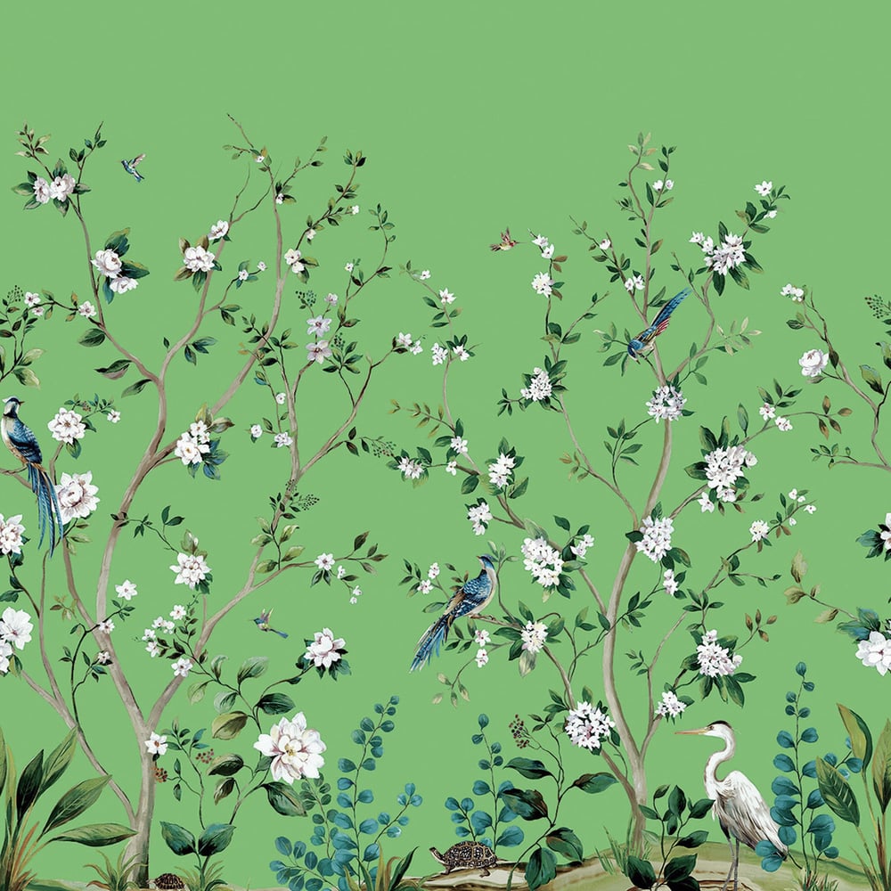 The Heron Botanical Mural from the Daisy Bennett collection is a serene and elegant wallcovering that brings the tranquil beauty of nature into your home. Designed in a refined Chinoiserie style, this mural features a graceful heron standing amidst a lush botanical landscape. Turtles wander nearby, and delicate hummingbirds flit among soft white blossoms, creating a harmonious and whimsical atmosphere.