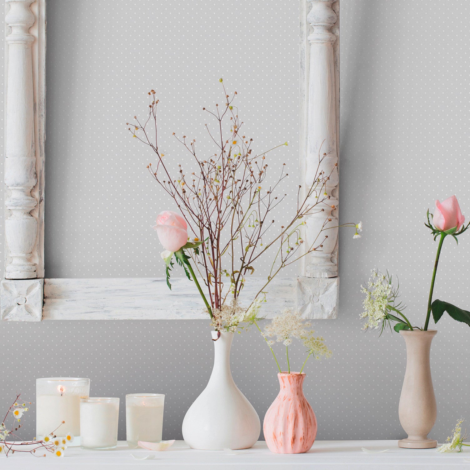 Add a touch of whimsy to your home with this charming polka dot motif wallpaper. Ideal for nurseries or playrooms, the simple yet striking design features small white polka dots on a muted background with a lightly textured matte finish. The subtle and elegant pattern creates a visually appealing look that is both timeless and playful.