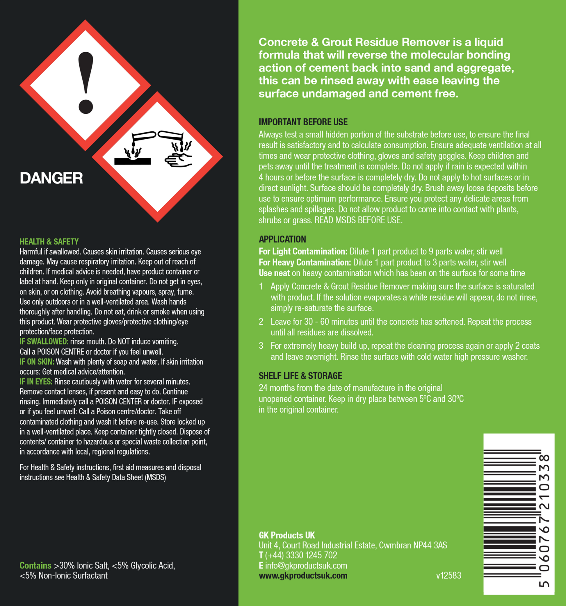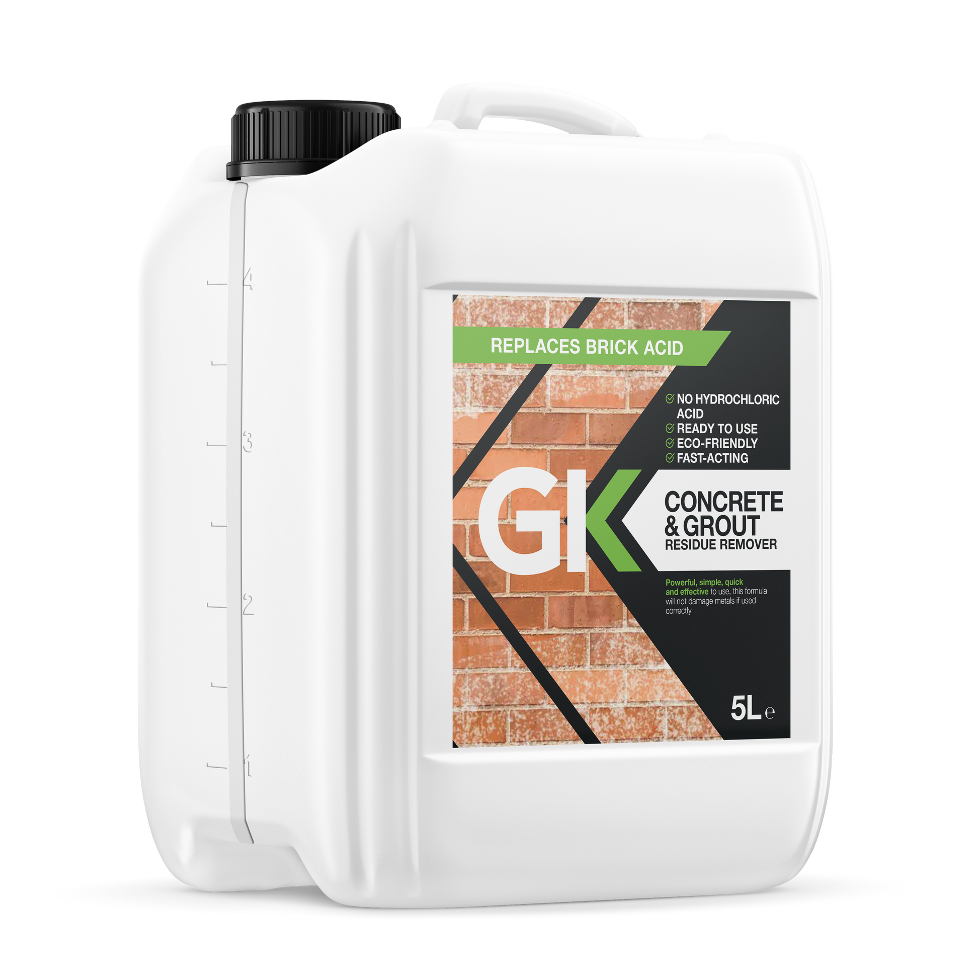 GK Concrete & Grout Residue Remover is a specialised liquid formulation designed to break down and remove cured cement, concrete, and grout residues from various surfaces. By reversing the molecular bonding process of cement, it effectively disintegrates hardened deposits back into their base components—sand and aggregate—allowing them to be rinsed away easily without causing damage to the underlying material.