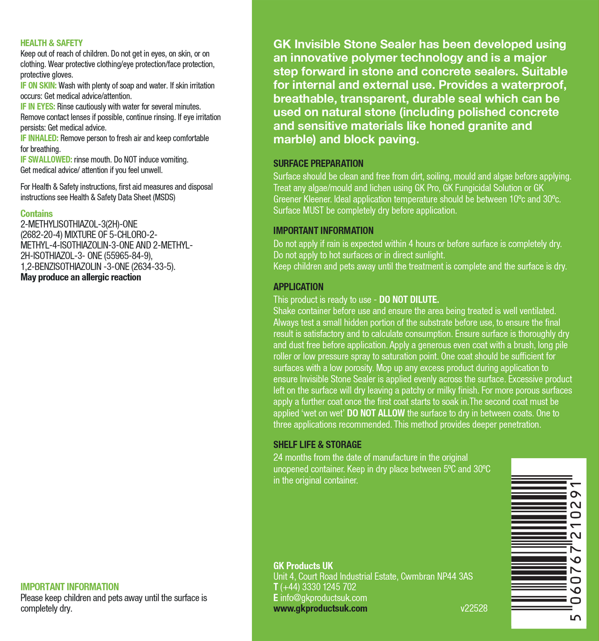GK Products Invisible Stone Sealer is an advanced solution designed to provide long-lasting protection for natural stone and concrete paving. Utilizing short chain per-fluorinated polymer technology, this sealer represents a significant advancement in the protection of stone surfaces. It penetrates deep into the material, forming a virtually invisible barrier that allows the stone to "breathe" while offering robust defence against various substances.