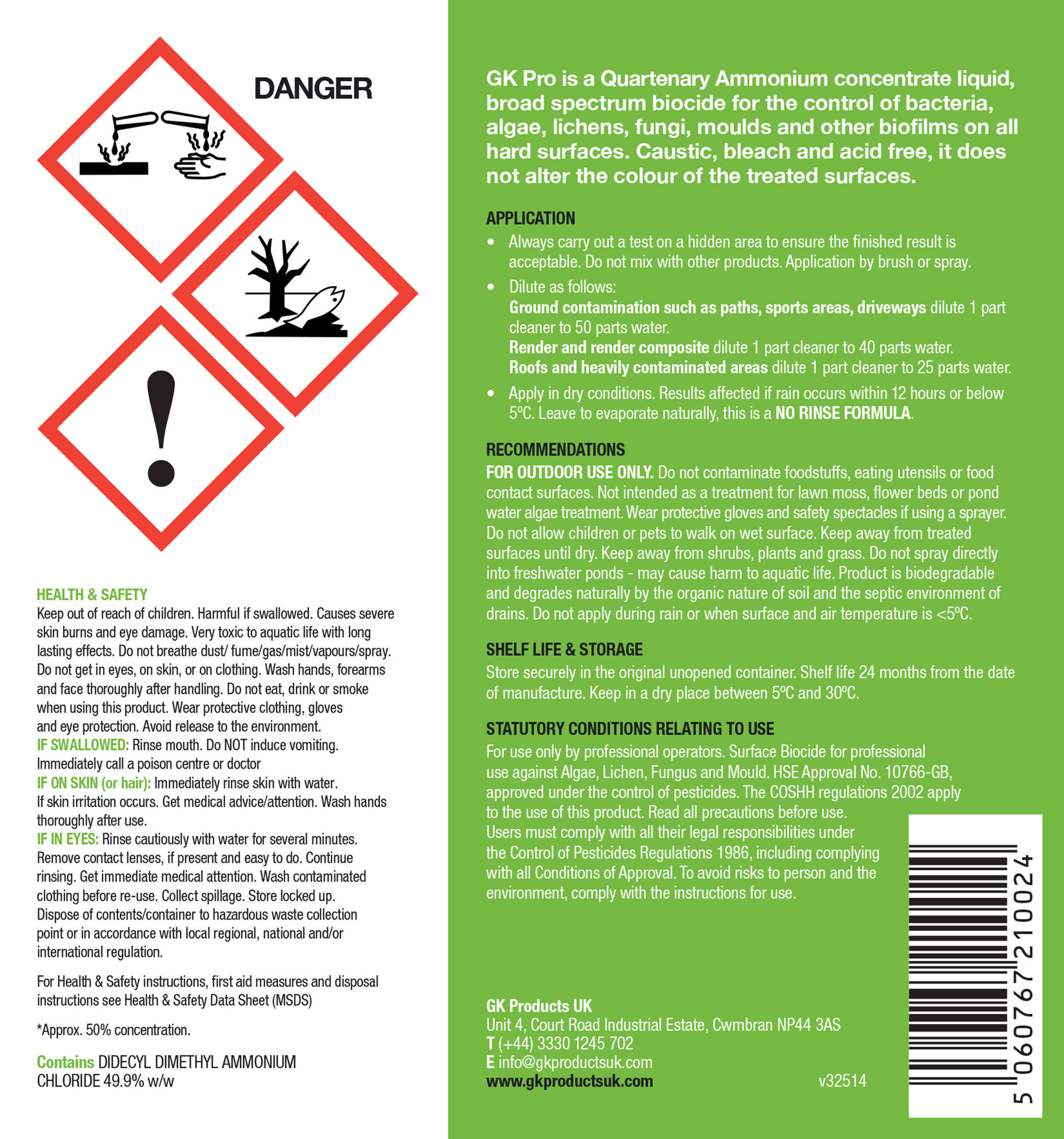 The active ingredient, DDAC, not only ensures immediate sanitisation by eliminating 99.9% of bacterial matter but also provides residual activity to prevent premature regrowth. For small areas, GK Pro can be applied using a simple garden sprayer, though appropriate PPE, such as gloves and eye/face protection, is strongly recommended.