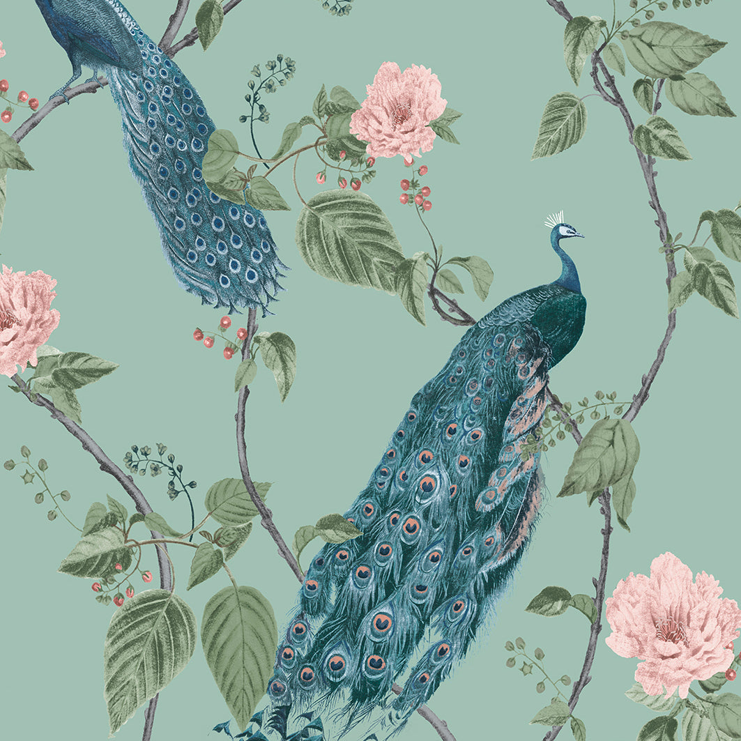 Taking inspiration from archives, Resplendence is a breath of fresh air! Beautifully perched peacocks with fancy florals make up this large repeat print.