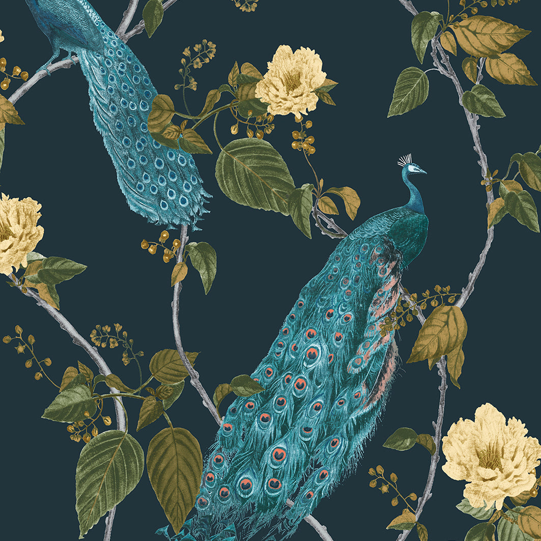 Taking inspiration from archives, Resplendence is a breath of fresh air! Beautifully perched peacocks with fancy florals make up this large repeat print.