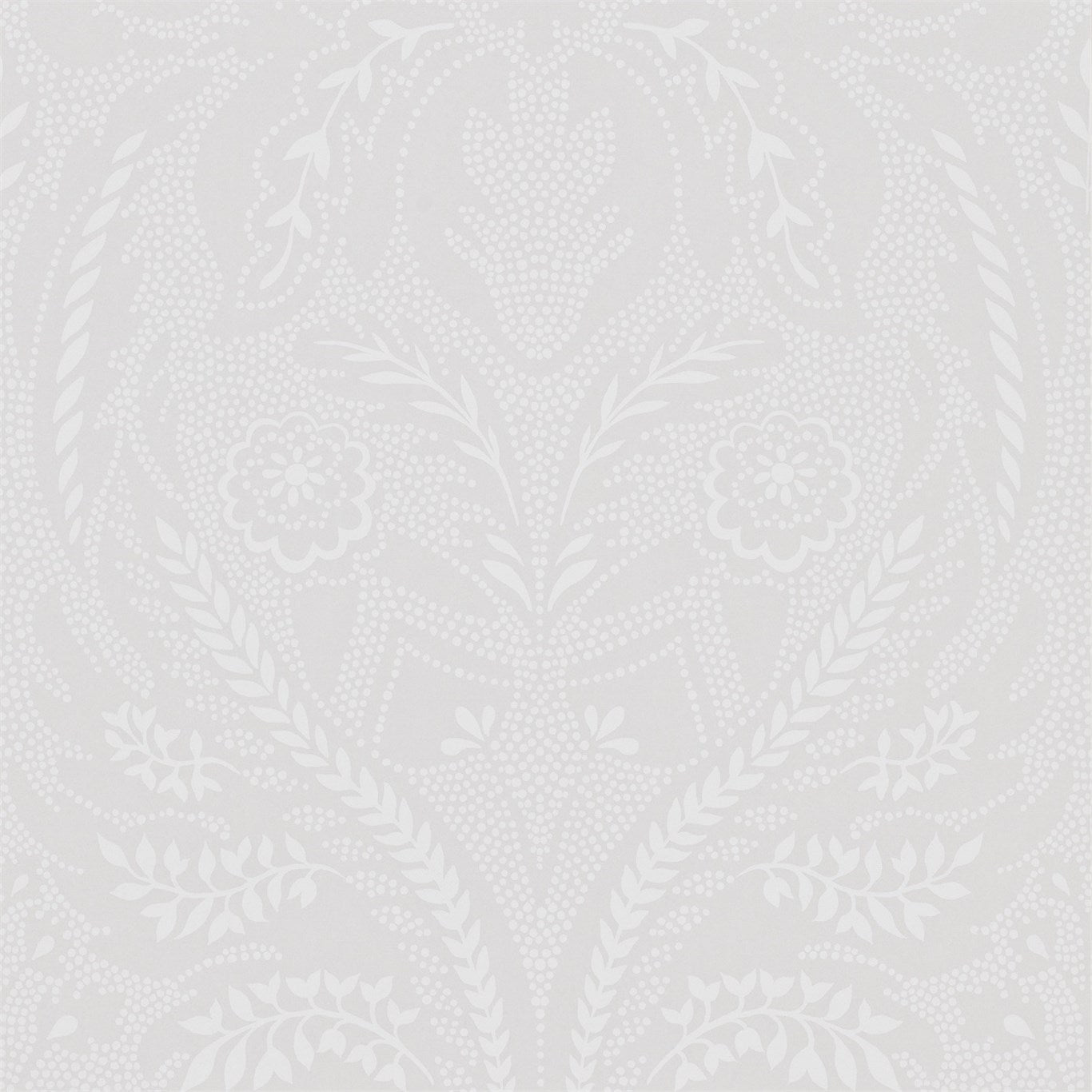 This delicately glamorous wallpaper features a damask motif of interlocking flowers in a mirror effect.