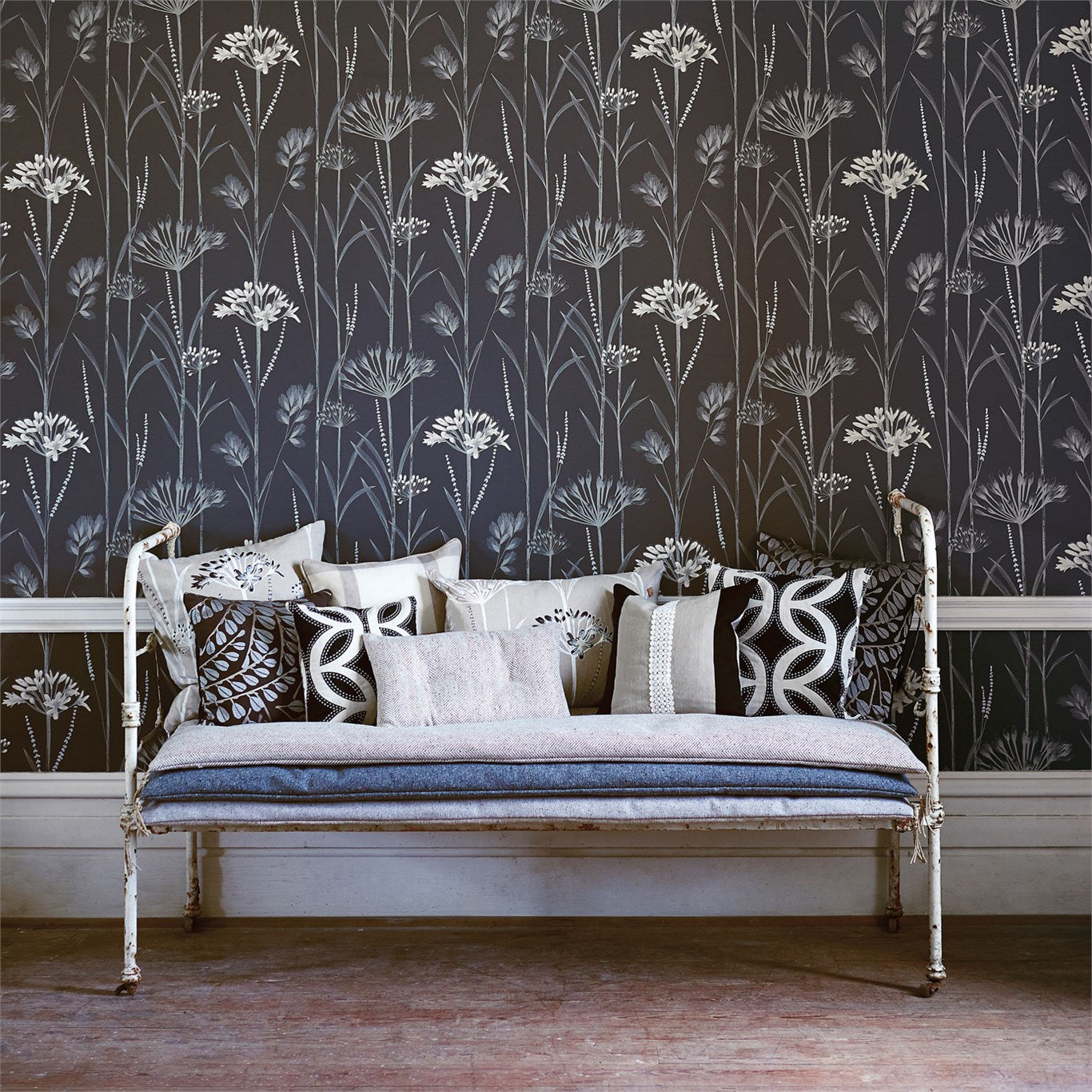An elegant trailing wallpaper design of long-stemed seedheads and grasses with metallic hints on plain backgrounds. Use to make walls appear taller in smaller spaces, or across large expanses of wall to catch the eye.