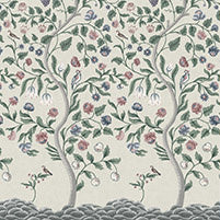 The Little Greene Mandalay Wallpaper draws its inspiration from the rich heritage of the dining room at Bateman's, a Jacobean mansion located in East Sussex. This design, with its intricate tree of life motif, harks back to the elaborate patterns found in 17th-century Indian chintzes. These chintzes often featured sinuous flowering trees with birds among their branches, and such designs were highly sought after during that era.