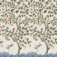 The Little Greene Mandalay Wallpaper draws its inspiration from the rich heritage of the dining room at Bateman's, a Jacobean mansion located in East Sussex. This design, with its intricate tree of life motif, harks back to the elaborate patterns found in 17th-century Indian chintzes. These chintzes often featured sinuous flowering trees with birds among their branches, and such designs were highly sought after during that era.