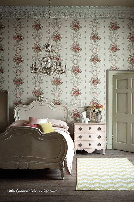 The Little Greene Palais Wallpaper is a classic interpretation of a pattern that's characteristic of French wallpaper panels produced by the manufacturer Réveillon from the late 1700s onwards. This design showcases a timeless elegance that is rooted in history.