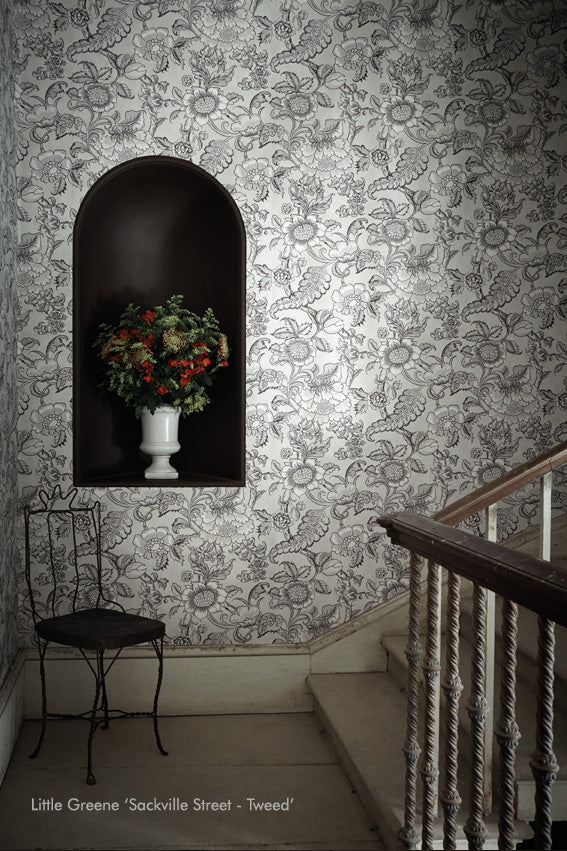 The Little Greene Sackville Street Wallpaper is a remarkable and well-preserved pattern found in the archive. What sets it apart is its impressive 99cm repeat and an unusual 80cm width. Each drop of this wallpaper is substantially wider than the standard 52cm wallpaper roll.