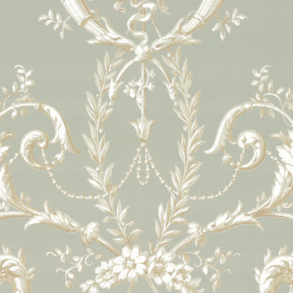 The Little Greene Versailles Wallpaper is a design inspired by a slightly later period than its traditional appearance might suggest. It's based on an original document that was machine printed in graded tones, creating a trompe l’oeil effect. This classic Rococo-style wallpaper features intricate scrollwork and cornucopia bursting with flowers, reflecting the opulence and elegance of the period.