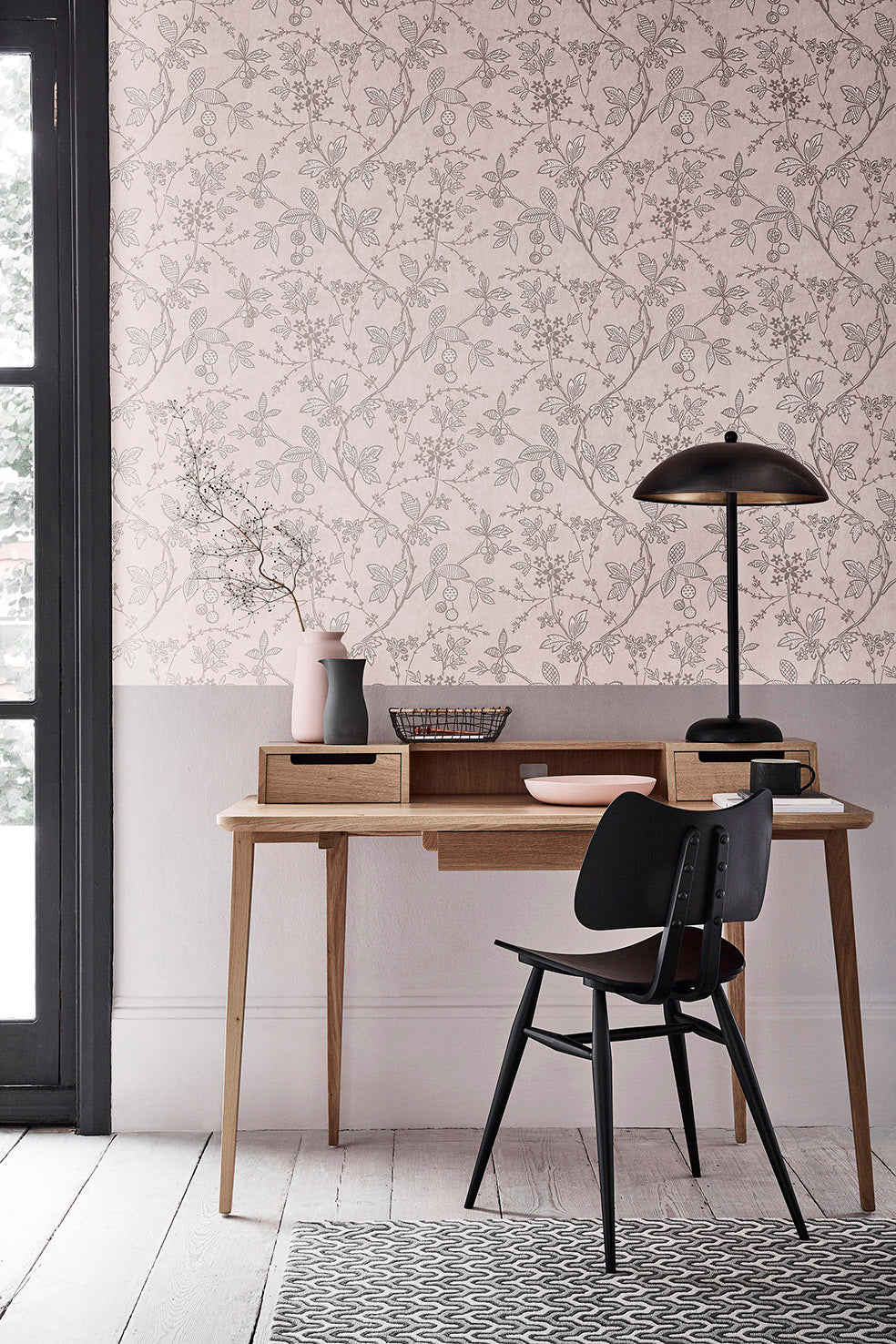 The Little Greene Wrest Trail Wallpaper is derived from a design found in the Archive and is noteworthy for its unique style of drawing that creates an all-over trail effect. The design features a structured, wandering stem adorned with relaxed and almost sketch-like interpretations of leaves and fruit. While it may appear more in line with mid-20th-century styles, it actually has its origins in a design from a hundred years earlier. This versatile wallpaper is available in five different colourways, offering a range of options to suit various interior design preferences.