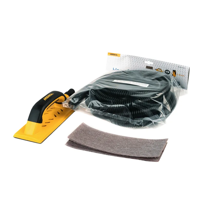 The Mirka Abranet Handy Kit is a complete solution for efficient and dust-free hand sanding. Designed for comfort and ease of use, the kit includes the ergonomic Mirka Handy 80 x 230 mm hand sanding block, a dust extraction hose, and five Abranet sanding sheets (1x P80, 3x P120, and 1x P180).