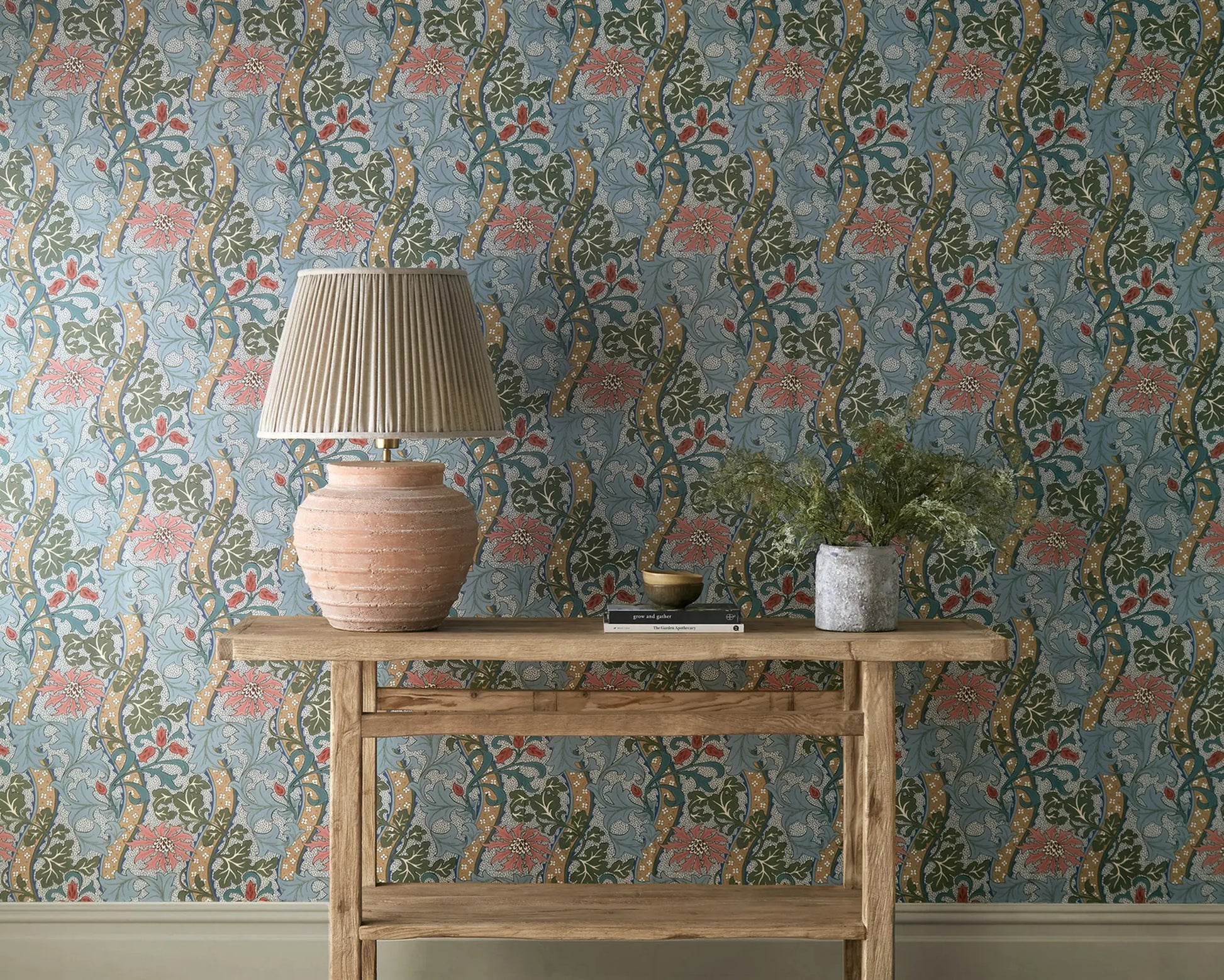 Drawn directly from an archive document inscribed by Dearle himself, the design reflects its intended use as a staircase paper, styled à la vine tapestry. Featuring tulips, acanthus, daisies, and, naturally, cornflowers, this surflex-printed wallpaper celebrates both Dearle’s artistry and the enduring floral themes of the Morris & Co. portfolio.