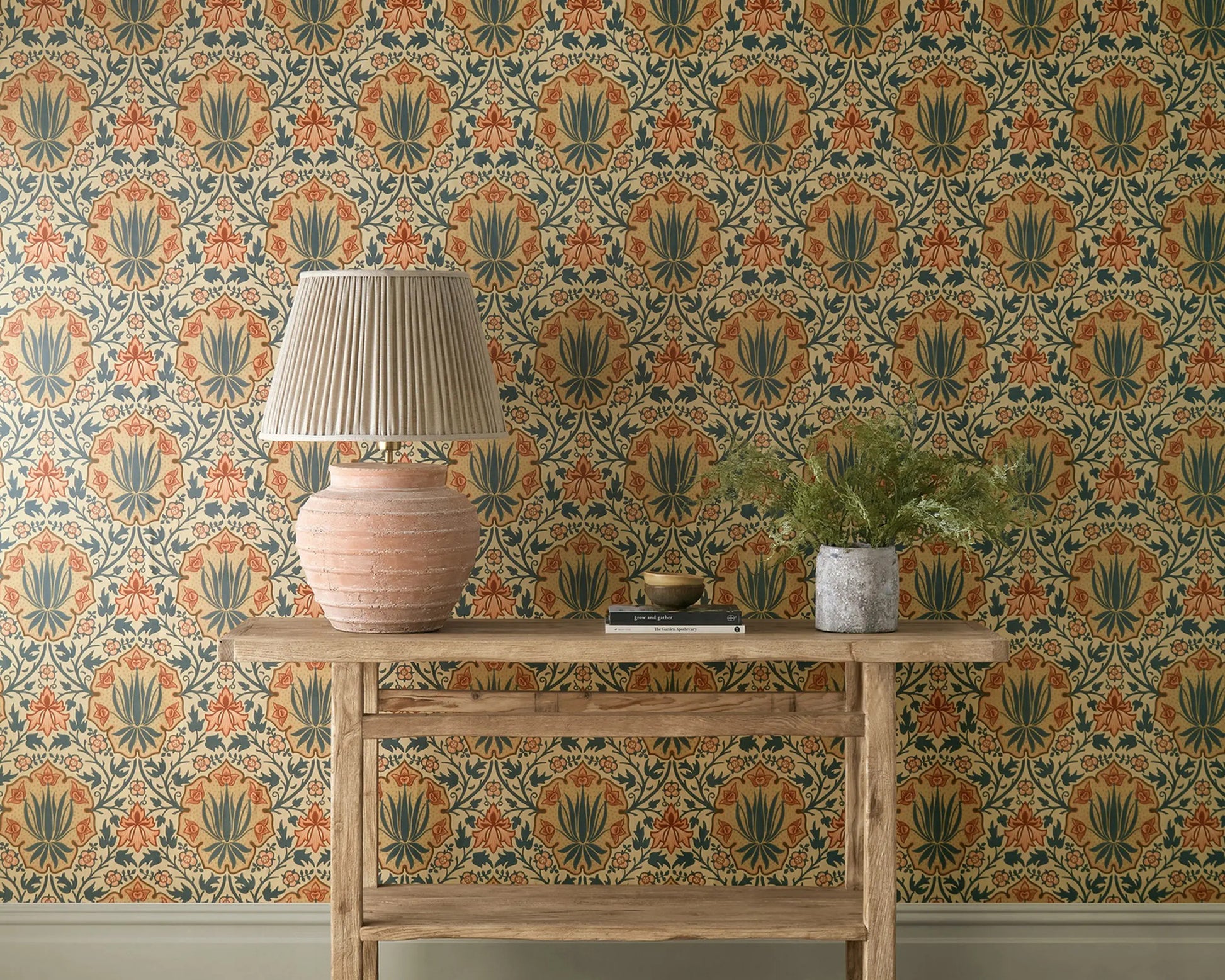 Vine leaves intertwine through the background, and the shield’s dotted detailing adds a subtle, playful charm. Surflex printed for clarity and depth, Iris & Rose combines historic decorative motifs with a lively, botanical elegance suited to a variety of interiors.