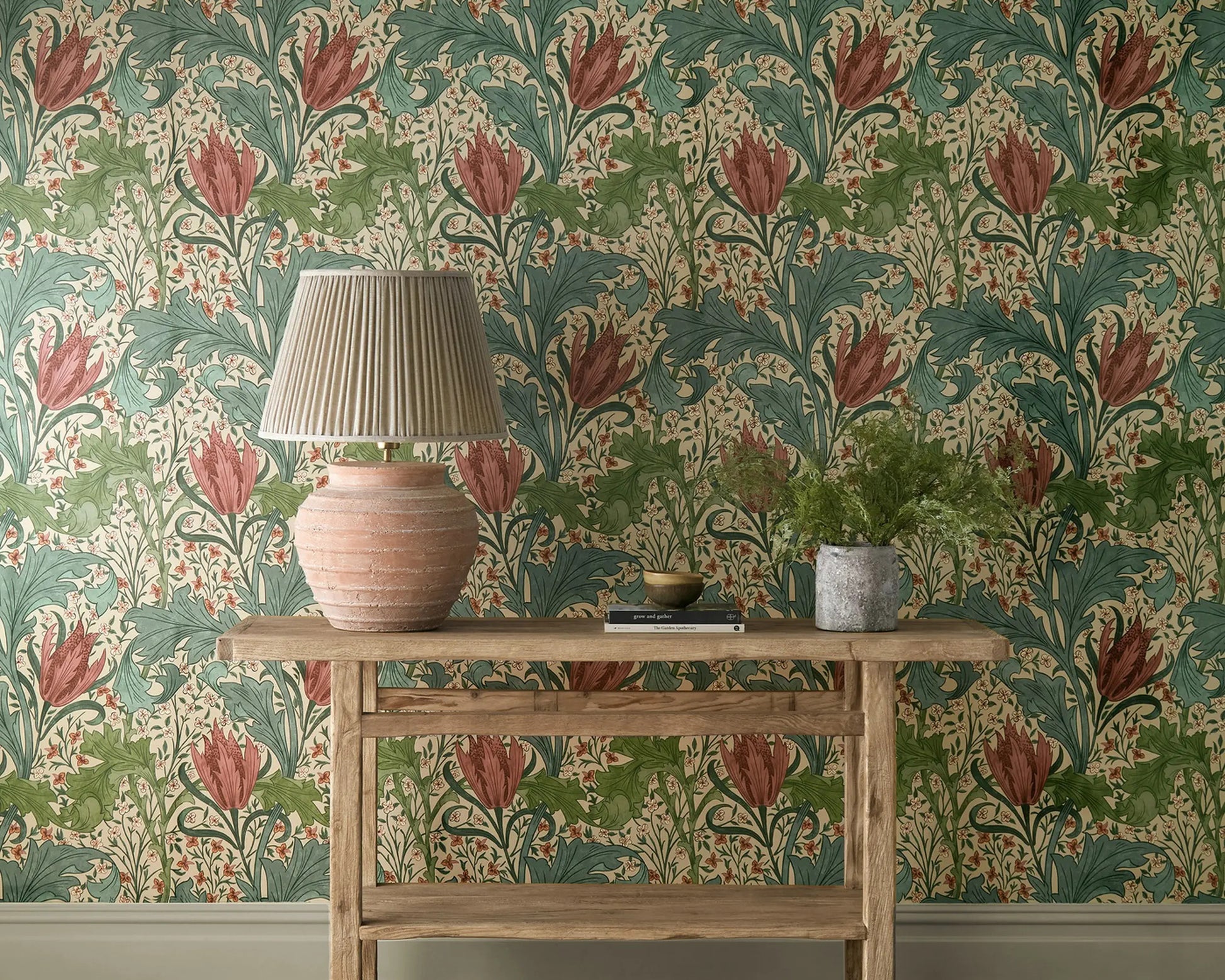 Morris & Co.’s Lent Lily wallpaper is based on a rarely seen watercolour from the archive, thoughtfully refined by the design team for modern use. The pattern features bold, stylised tulip motifs contrasted with the swirling forms of acanthus leaves, combining dynamic floral shapes with classic Morris decorative language.
