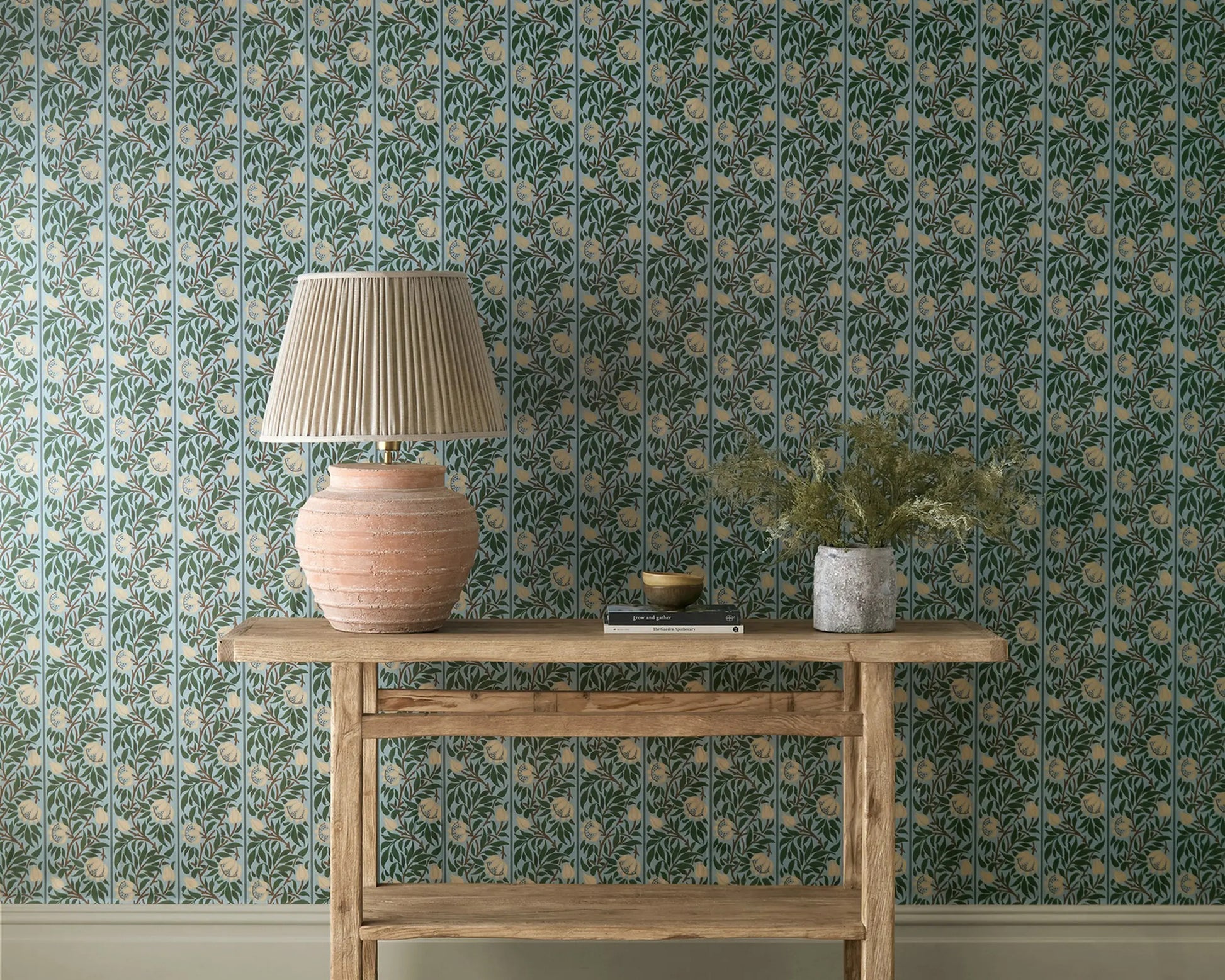 Morris & Co.’s Peony Trellis wallpaper transforms an original border design into an all-over repeat, creating a continuous, elegant pattern. The composition features a climbing trellis adorned with stylised peonies, forming a subtle ogee motif that adds rhythm and structure to the wall.