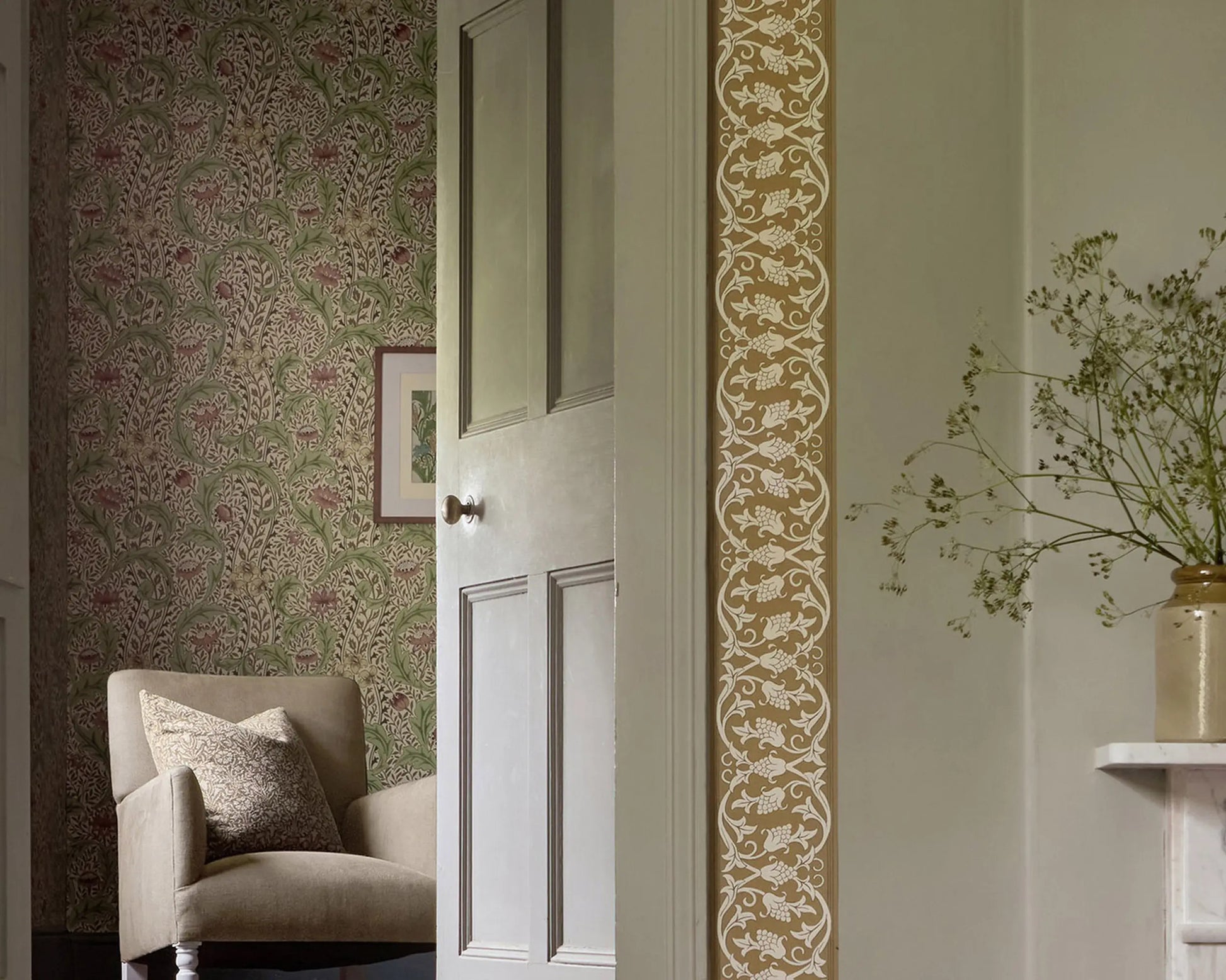 Translated into a wallpaper border, the pattern retains its elegant, linear quality and classical symbolism, offering a refined decorative element that echoes the artistry and heritage of Morris & Co.’s stained-glass and textile traditions.
