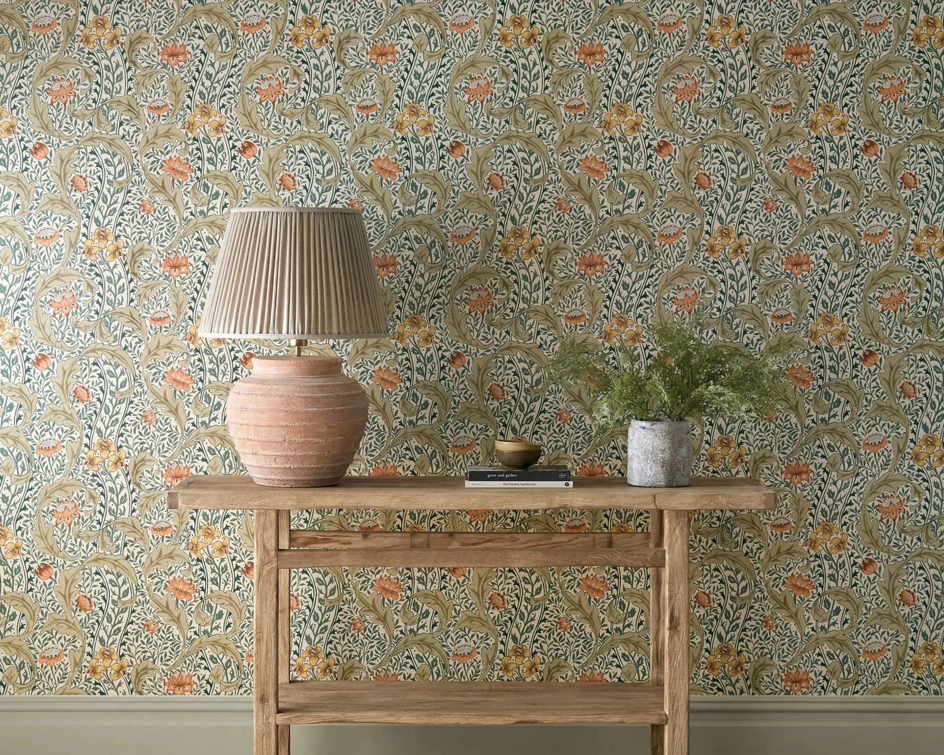 Morris & Co Wallpaper Wild Tulip & Vine Coral/Teal MUNW217578