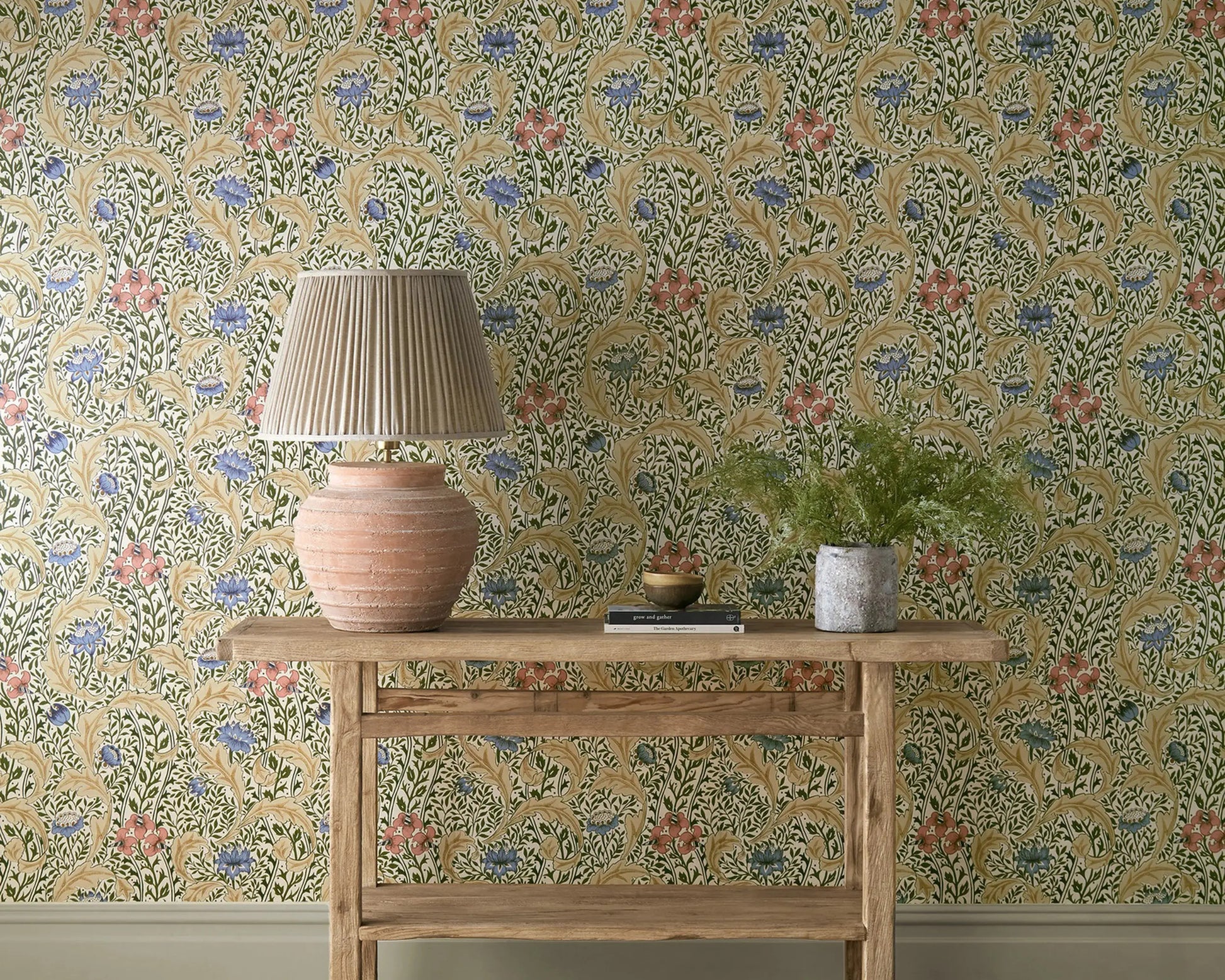 Morris & Co.’s Wild Tulip & Vine wallpaper draws from an archival Huntington document, showcasing tulips amid leafy vines and vertical scrollwork interspersed with stylised flowers. The design is possibly by John Henry Dearle, identifiable through the conical stamens of the central flowerheads, reminiscent of his Golden Lily motif.