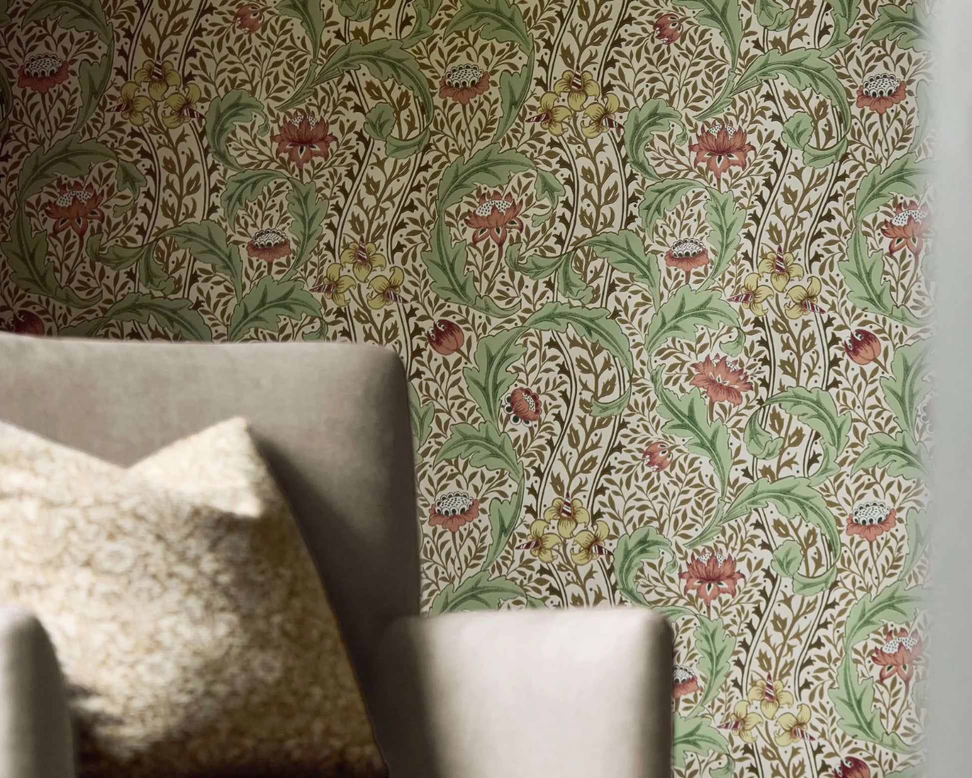 Morris & Co.’s Wild Tulip & Vine wallpaper draws from an archival Huntington document, showcasing tulips amid leafy vines and vertical scrollwork interspersed with stylised flowers. The design is possibly by John Henry Dearle, identifiable through the conical stamens of the central flowerheads, reminiscent of his Golden Lily motif.