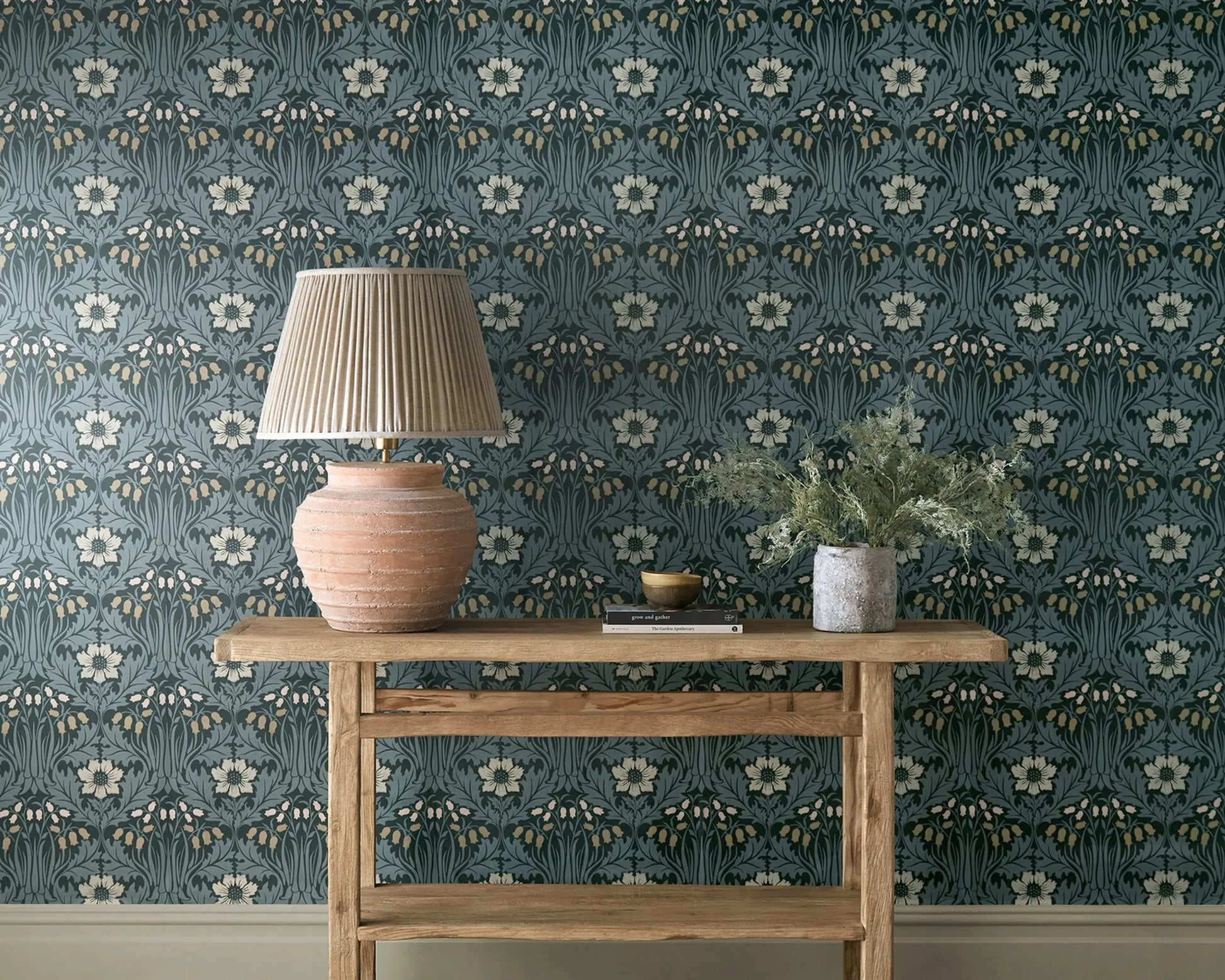 Morris & Co.’s Woodbell & Anemone wallpaper transforms a small archival sketch into a full-scale, richly coloured design. The original sketch featured an anemone as the central motif, surrounded by bluebells, which has been expanded into a figure-of-eight layout forming a simple ogee pattern.